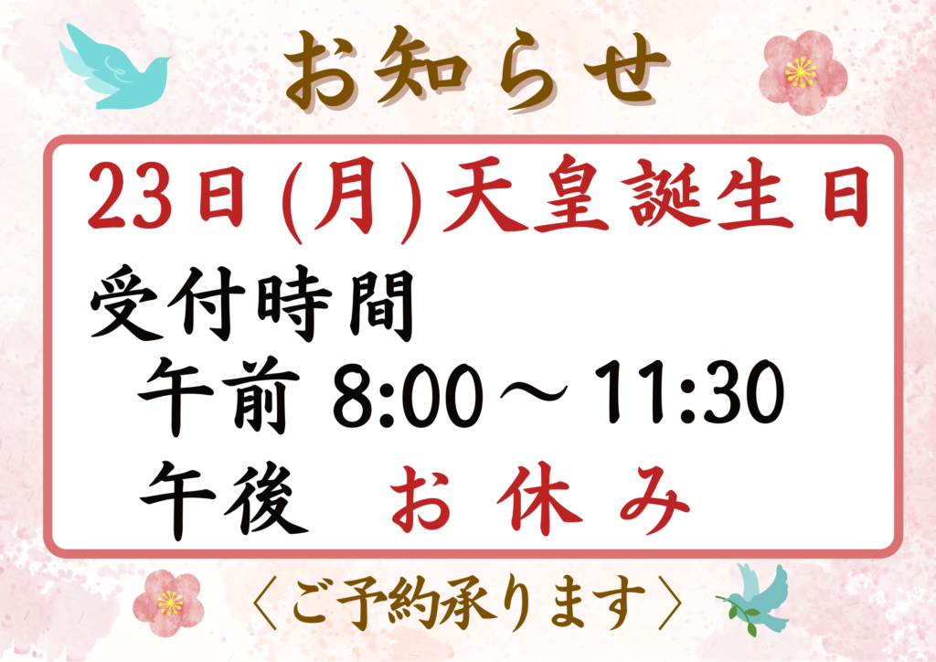 【受付時間】午前 8:00~11:30午後 お休み※当日のご来院も受け付けております。(お手数をおかけしますが、ご来院前にお電話をお願いいたします。)